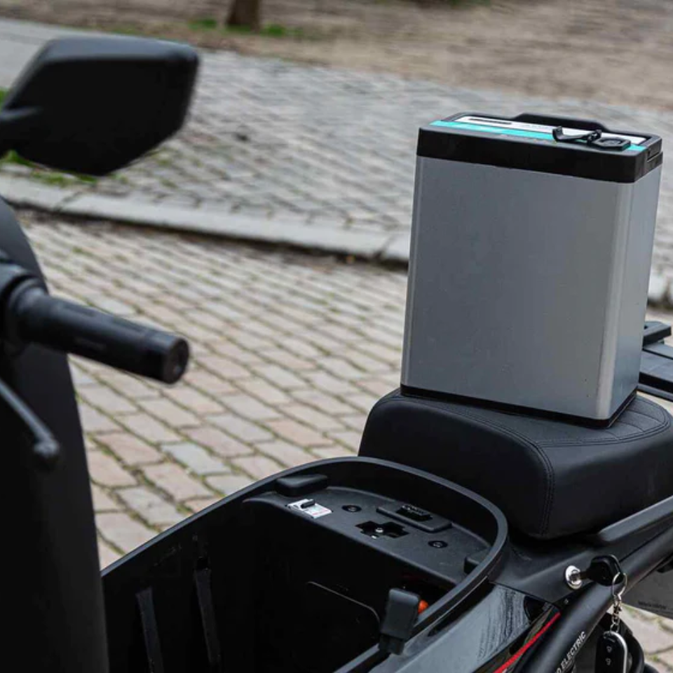 Obe batérie umiestnené v časti pod sedadlom môžete bez námahy vybrať a vymeniť za plne nabité, alebo si ich vziať so sebou a nabiť kdekoľvek.